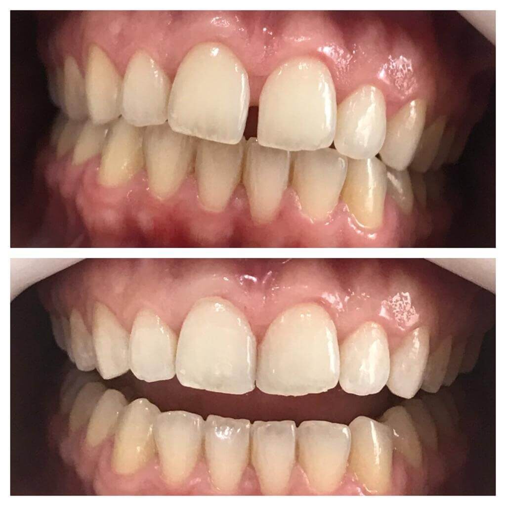 Fechamento de diastema( espaço entre os dentes) com resina composta nos dentes incisivos centrais. Tratamento feito em uma única sessão e sem nenhum tipo de desgaste dentário.